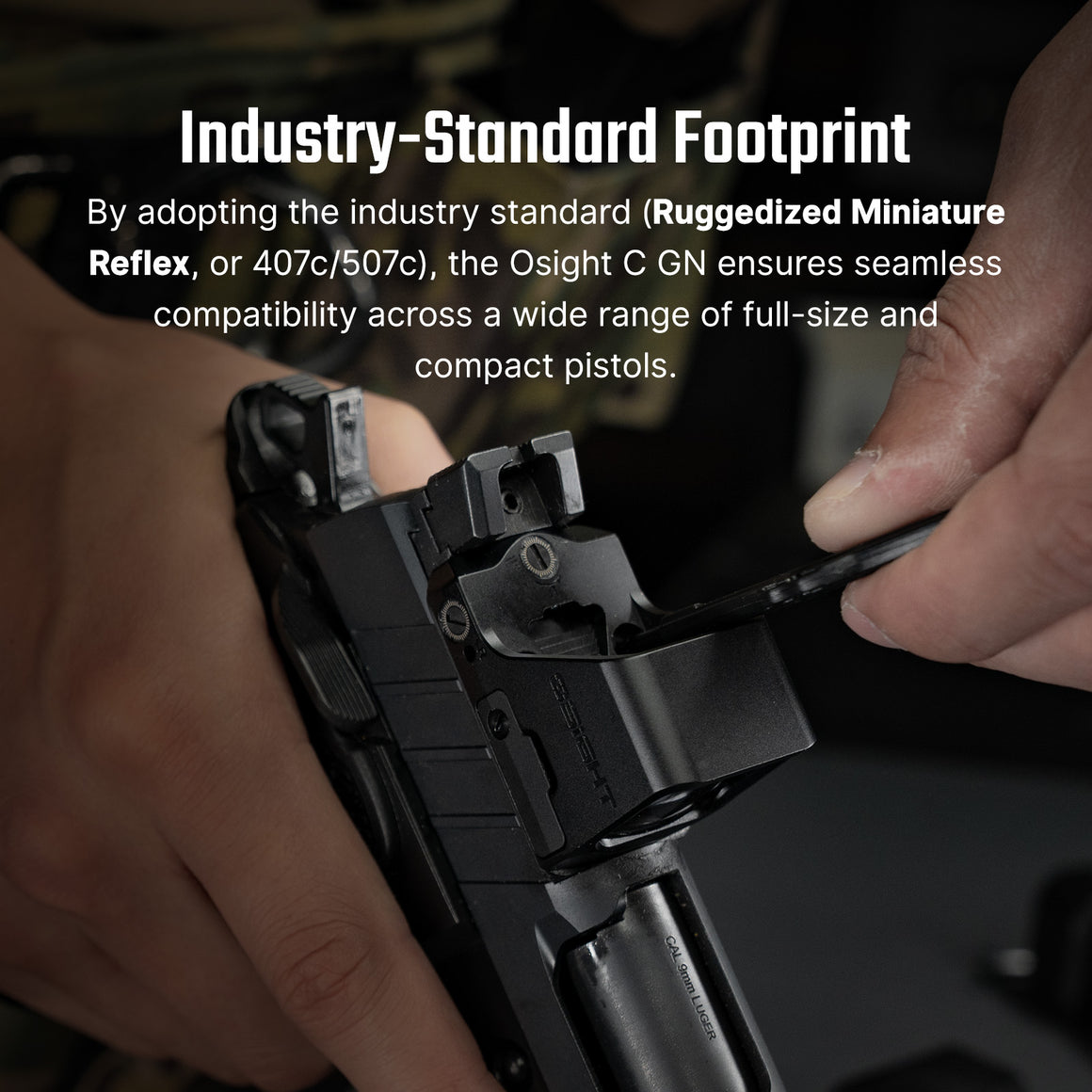 • Most Common Footprint: By adopting the de facto industry standard (Ruggedized Miniature Reflex, or 407c/507c footprint), Osight C GN is a versatile addition to many full-size and compact pistols.