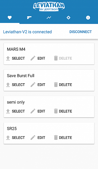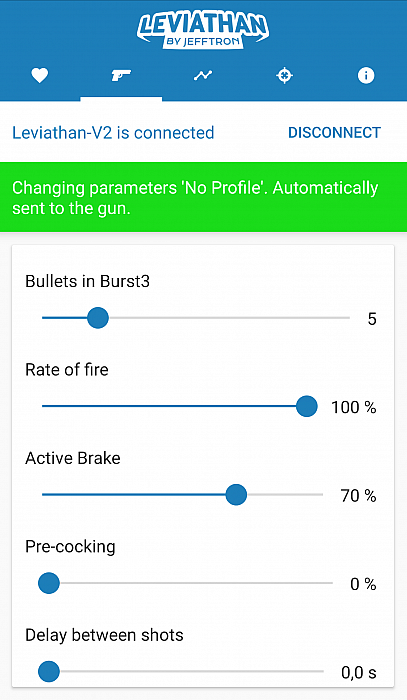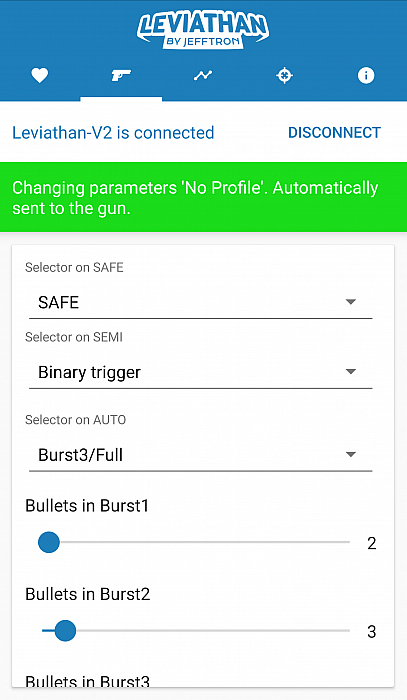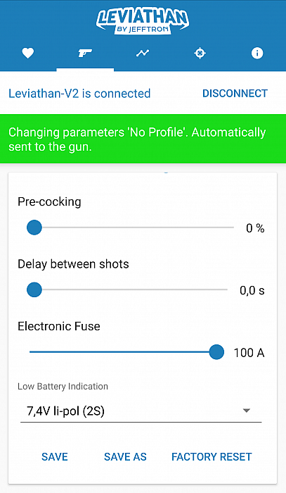 - Programmed settings are saved in the Leviathan - V2 memory immediately after their change, so settings aren't lost when is battery disconnected or lost connection with smartphone