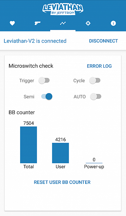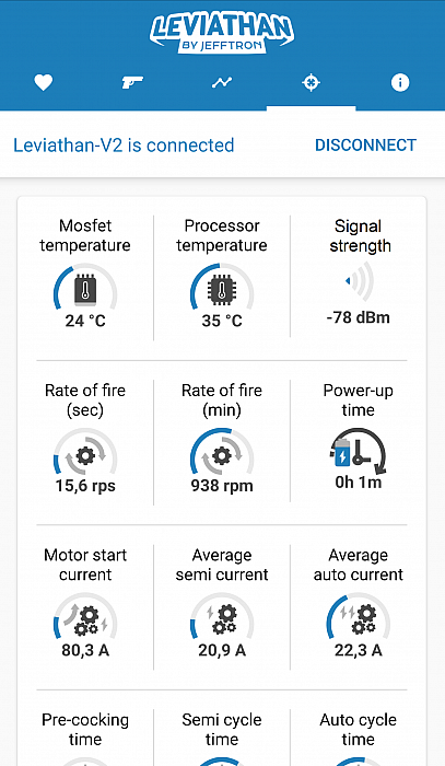 - Statistics screen shows shooting output with cycle timing, motor current consumption, rate of fire and mosfet temperature. It allows you to do fine-tune gearbox upgrade