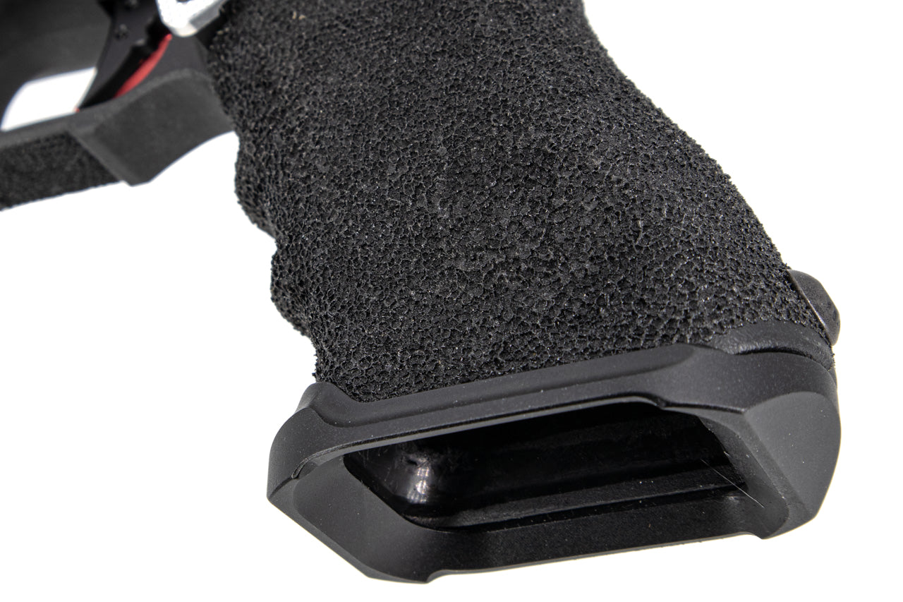 The MEC x PTS ZEV G17 Custom is equipped with the PTS Zev Prizefighter Slide Kit which comes with an RMR cut that lets you fit a Trijicon RMR. The frame of the TM G17 (Gen 3) is highly modified with fully textured handguard provides superior grip and traction. The high-strength brass constructed MEC M-Valve is also installed for providing a faster cycling with this steel slide pistol.