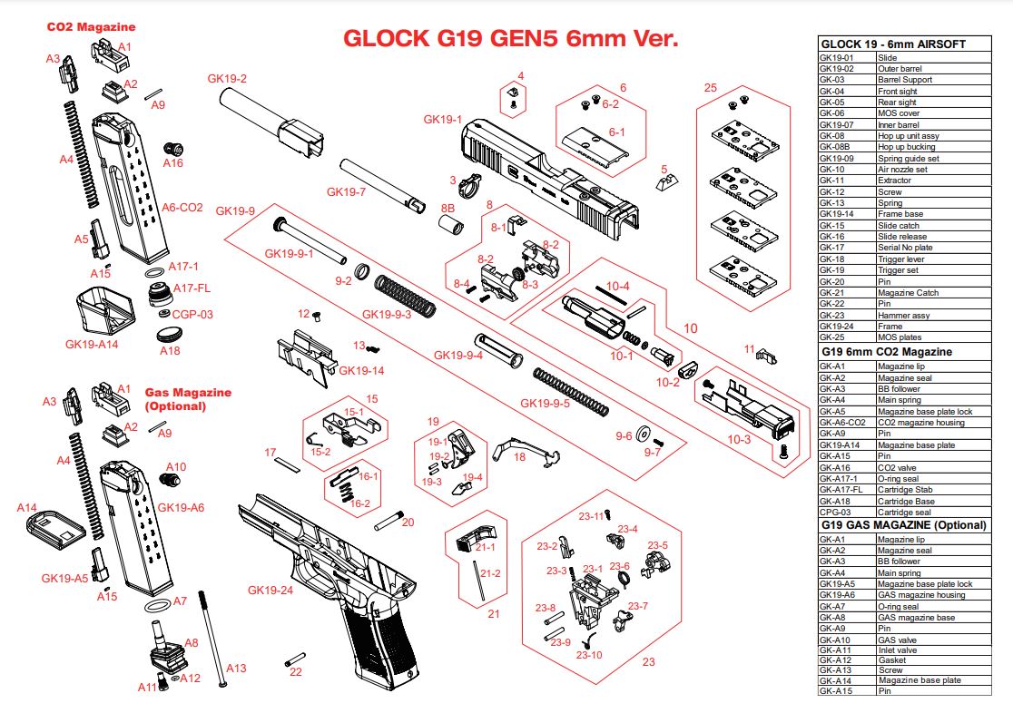 Umarex Glock 19 Gen 5 MOS Gas GBBP Airsoft Explosion Parts ( SRC G19 Gen5 MOS / Original Parts )